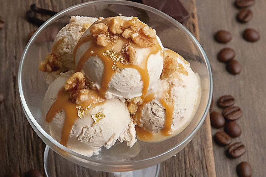 Verter la mezcla de helado en un recipiente y congelar. Cuando el helado esté casi listo, agregar los trozos de nueces caramelizadas y congelar hasta que esté firme.