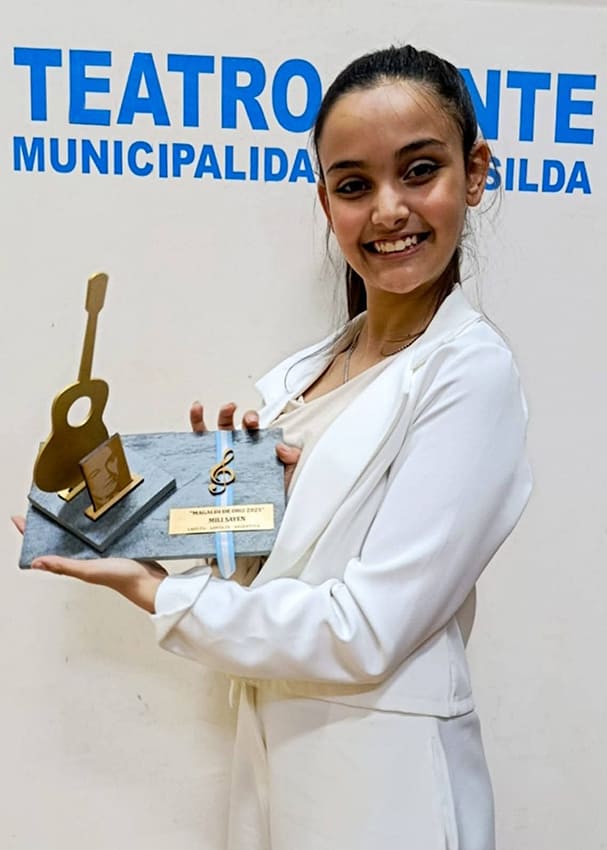 Arranqué a cantar por mi abuela Graciela, que falleció de cáncer. Uno de sus sueños era que yo sea cantante y acá estoy, cumpliéndolo”, dice la bahiense Mili Sayen, de 14 años, reciente ganador de los premios internacionales Agustín Magaldi de oro y de platino 2025.